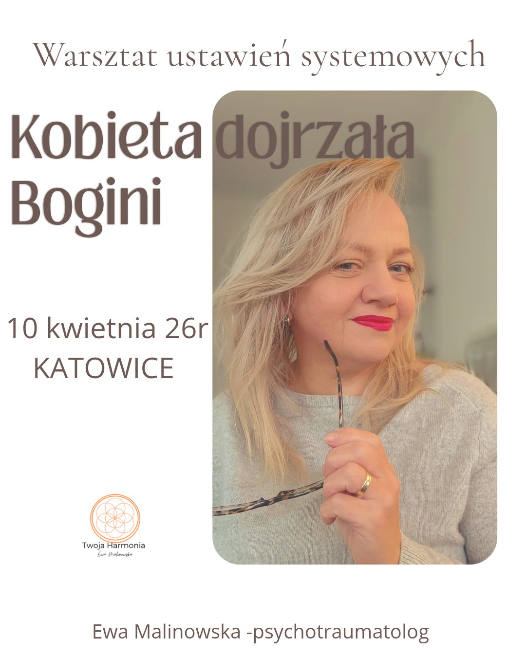 Jest świadomym krokiem ku wolności i drogą prowadzącą do prawdziwego spełnienia. Każda kobieta w którymś momencie życia przekracza próg trzeciej fazy. To moment, którego nie da się zatrzymać ani zagłuszyć. Można wtedy kurczowo trzymać się młodości. Albo zatrzymać się i zapytać:Albo zatrzymać się i zapytać: co we mnie teraz chce się obudzić. Dojrzałość nie jest wycofaniem się z życia.Jest wejściem głębiej. Dojrzała kobieta zaczyna zauważać, gdzie przez lata przekraczała siebie. Gdzie mówiła „tak”, choć ciało mówiło „nie”Gdzie była lojalna wobec rodu, partnera, dzieci – ale nie wobec siebie.To czas, kiedy kobieta przestaje się wstydzić swojego wieku. Przestaje się porównywać.Zaczyna wybierać świadomie – relacje, pracę, sposób życia wtedy naprawdę staje się twórcza.Wolna. Mocna ale już nie tą napiętą siłą.Tylko spokojną, ugruntowaną obecnością. Jean Shinoda Bolen pięknie przedstawiła archetypy bogiń i była moją inspiracją by stworzyć ten warztat.